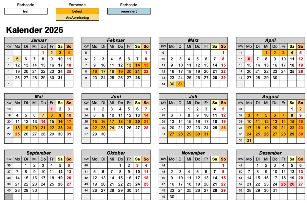 | Preistabelle 2026 | 01.01.26 – 07.01.26 | 08.01.26 – 31.03.26 | 01.04.26 – 31.10.26 | 01.11.26 – 19.12.26 | 20.12.26 – 31.12.26 |